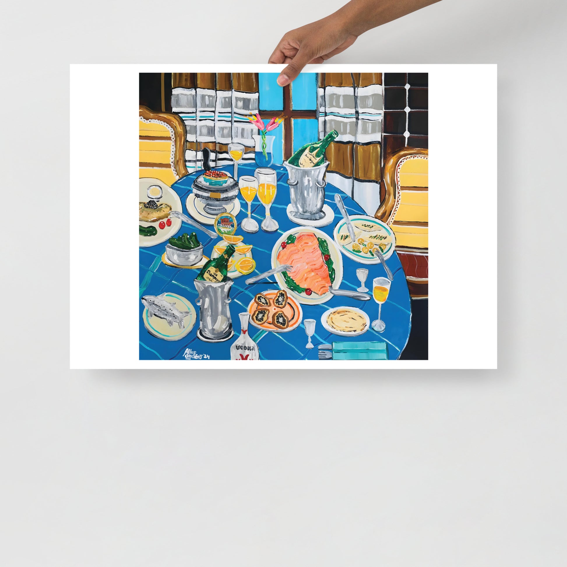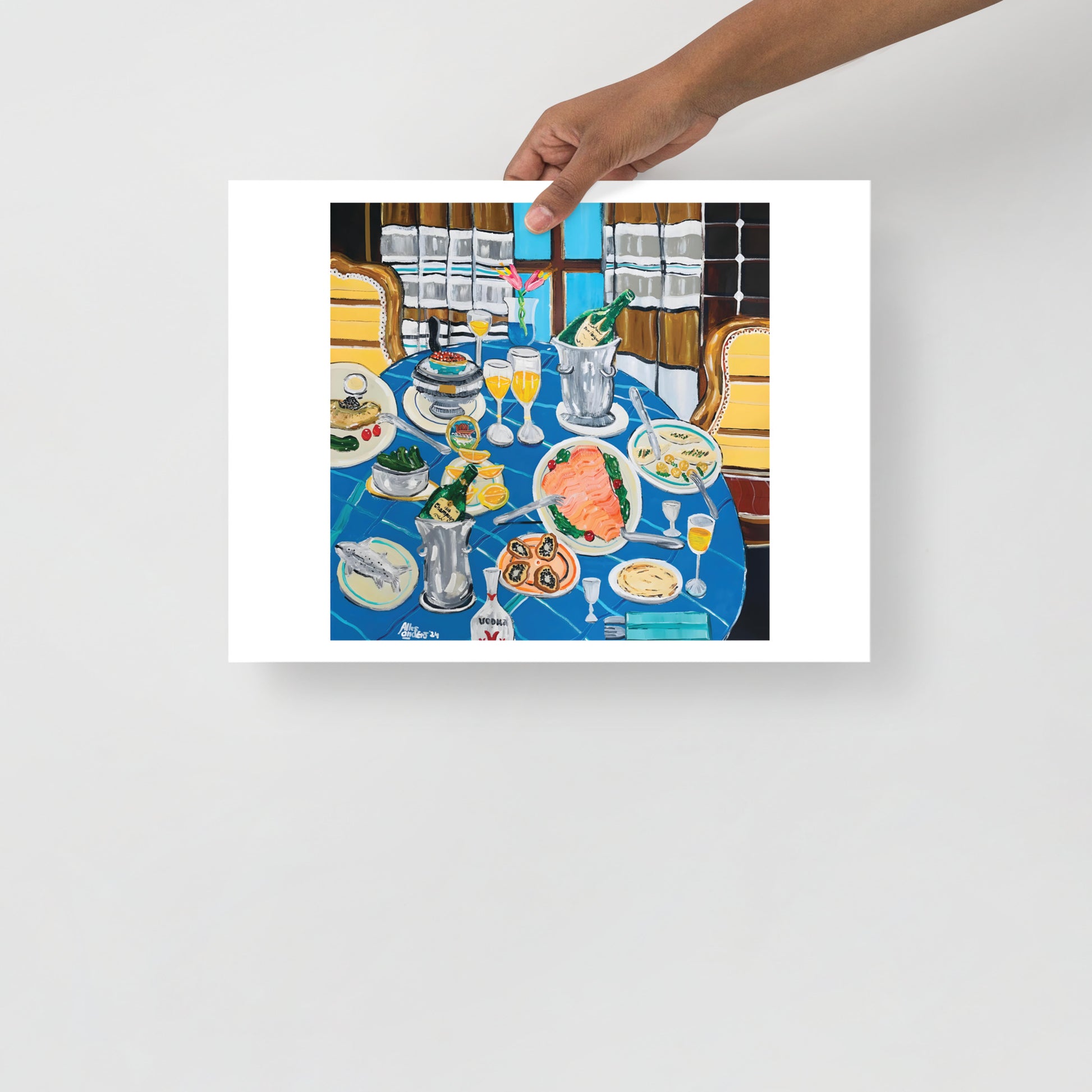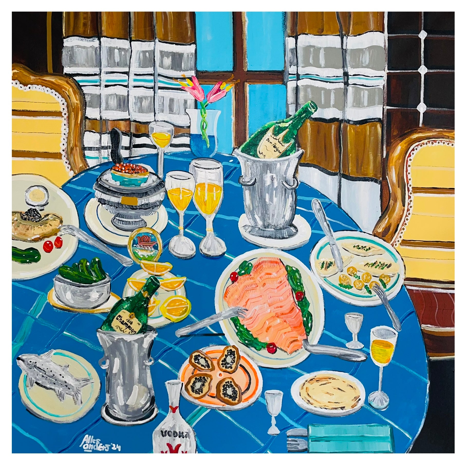 The painting depicts a charming Parisian brunch, featuring a beautifully set table draped in a rich blue cloth that adds elegance to the scene.