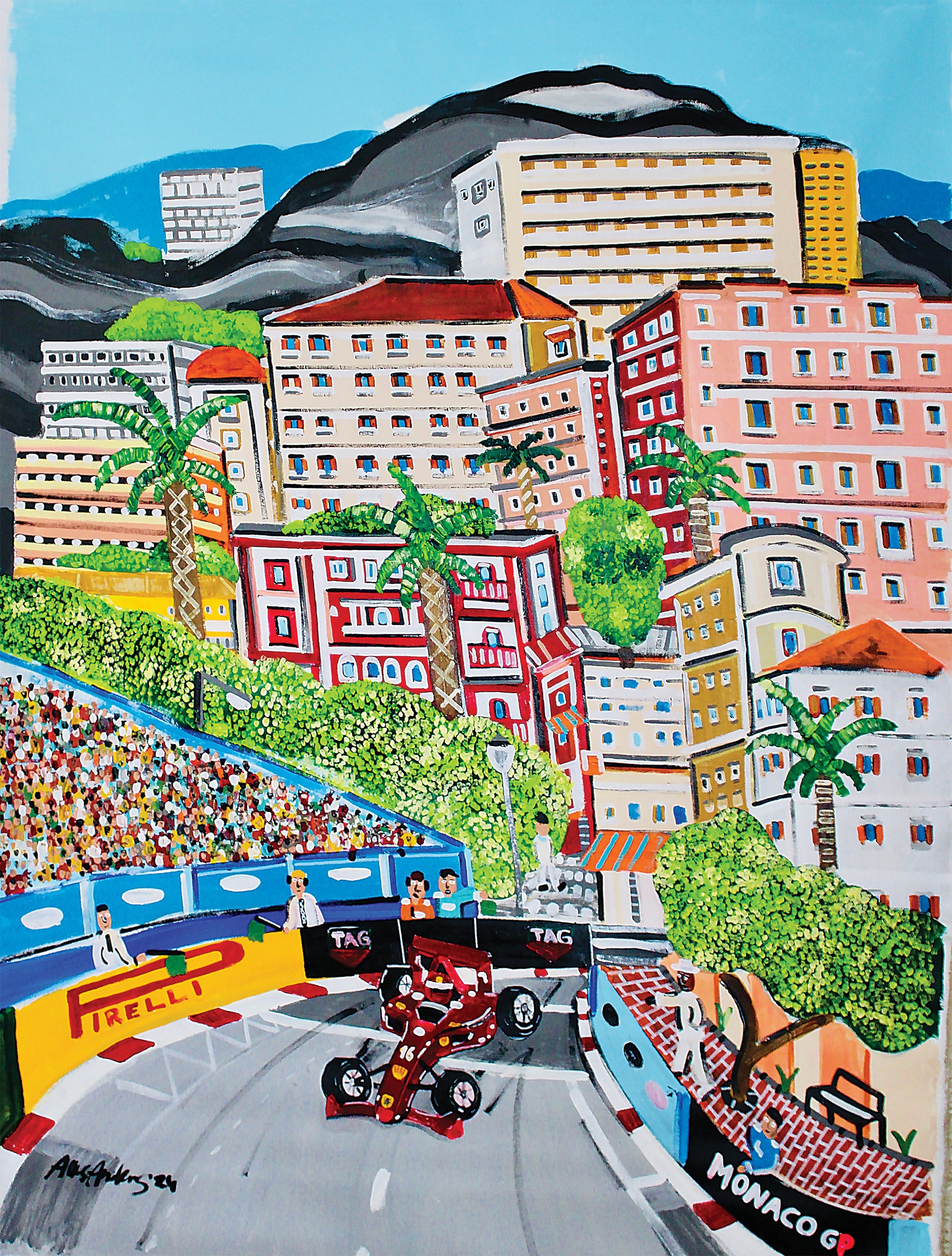 The painting captures Charles Leclerc skillfully navigating the iconic hairpin curve at the Fairmont Hotel during the 2024 Monaco Grand Prix. Leclerc’s Ferrari is depicted in dynamic motion, tires gripping the asphalt as he executes the turn with precision and focus.
